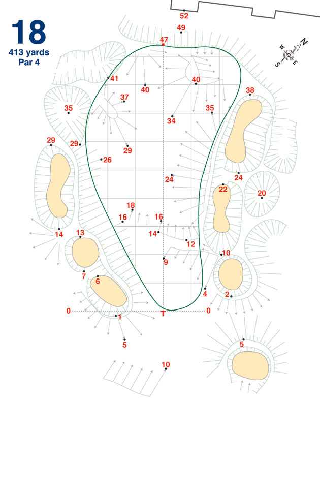 The plotting of slopes and hollows on greens is a meticulous process requiring 2-3 hours of survey per green. The finished graphics bisect the playing line, with measures to slopes, hollows and bunkers. The green is divided into five yard/metre squares with slopes and hollows indicated with directional lines/arrows. Exceptional putting aids.