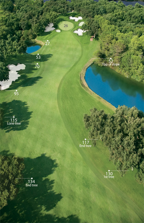 Photo annotated with reference lines and distances to important hole features including directional guidance to fairway ‘safe areas’ and distance run- outs to hazard extremities. Exceptional course management aid.