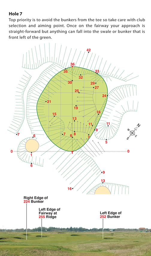 Photo annotated with reference lines and distances to important hole features including directional guidance to fairway ‘safe areas’ and distance run- outs to hazard extremities. Exceptional course management aid.